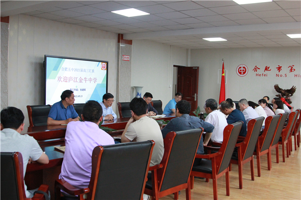5月13日,庐江金牛中学校长吴海洋、副校长刘荣举带领该校高三团队老师莅临合肥五中交流研讨,校长周祖保校长、副校长沈龙海等校领导热情接待金牛中学一行。