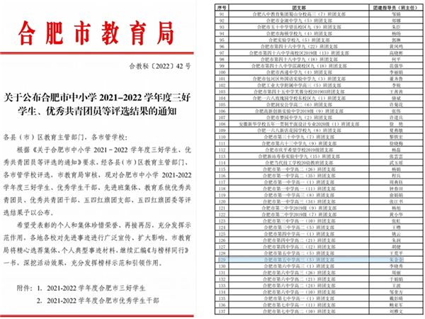 合肥五中2019级高三(5)班团支部荣获2021-2022学年度合肥市教育系统“五四红旗团支部”。三年来,在班主任朱金金老师的带领下,高三(5)班建立了“团结友爱,奋发进取”的优良班风,形成了“勤问、多想、互助”的优良学风,在思想建设、学风建设、班级建设等方面取得的成绩显著。